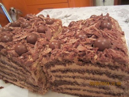 Бисквит: шоколад на кипятке. Крем: шоколадно-заварной или крем-брюле (по желанию можно добавить орешки)
